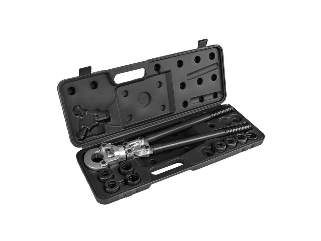 Lis na krimpování PEX konektorů 02-445 NEO je ruční nářadí nabízené v setu s kalibrátorem trubek pro 16, 20 a 25 mm s odjehlovačem v těle a dále 4 kusy U tvarovek a 4 kusy TH tvarovek: