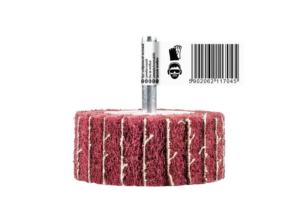 Určen je pro použití s vrtačkami a přímými bruskami. Flexibilní lamely z elektrokorundu se syntetickou pryskyřicí se přizpůsobí tvaru obrobku a zajišťují spolehlivý výkon i při náročnější práci. Gradace P120 je ideální pro závěrečné broušení a přípravu povrchu před finální úpravou.