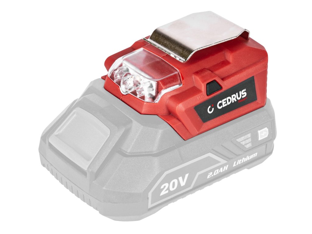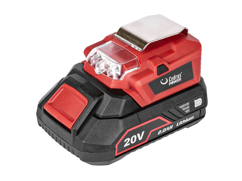 USB nabíječka Cedrus CEDCHPLI je chytré příslušenství k bateriovému systému Cedrus Power+ 20 V, které umožňuje nabíjet mobilní zařízení prostřednictvím portu USB typu A (5 V, 1,5 A). Integrovaná LED lampa poskytuje 30 lumenů světla pro práci v podmínkách se sníženou viditelností. Ovládání je snadné díky tlačítku aktivace adaptéru a indikaci napájení.