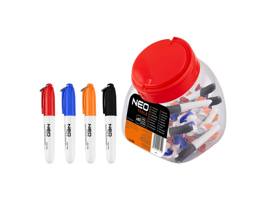 Mini fix NEO TOOLS 13-866 je spolehlivý permanentní popisovač určený pro každodenní použití v dílně, kanceláři, škole i domácnosti. V balení se nachází 80 kusů v praktické sklenici, přičemž jsou zastoupeny čtyři výrazné barvy: červená, modrá, černá a oranžová.