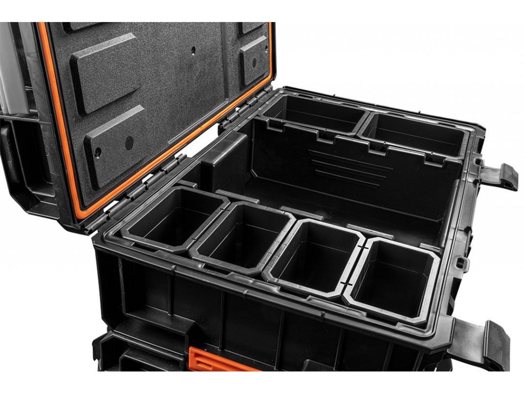Moduly se vyznačují mnoha výhodami, jako jsou nastavitelné přepážky, robustní zámky, pevná rukojeť, utěsněná víka, odolnost proti prachu a vodě, hluboké vaničky, vybrání pro řezání s měřítkem, velký objem.