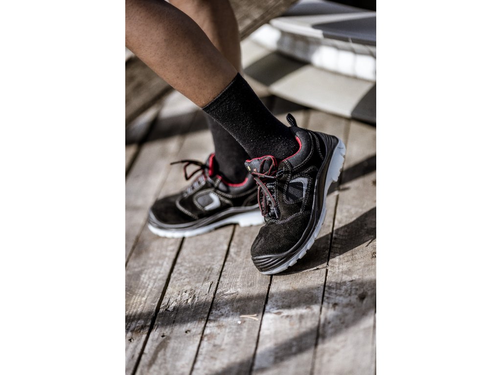 Tužinka ze skelných vláken poskytuje ochranu prstů, zatímco textilní mezipodešev odolná proti perforaci chrání chodidlo před ostrými předměty. Protiskluzná PU/TPU podešev je navržena tak, aby zajišťovala maximální stabilitu i na kluzkých površích (certifikace SRC).