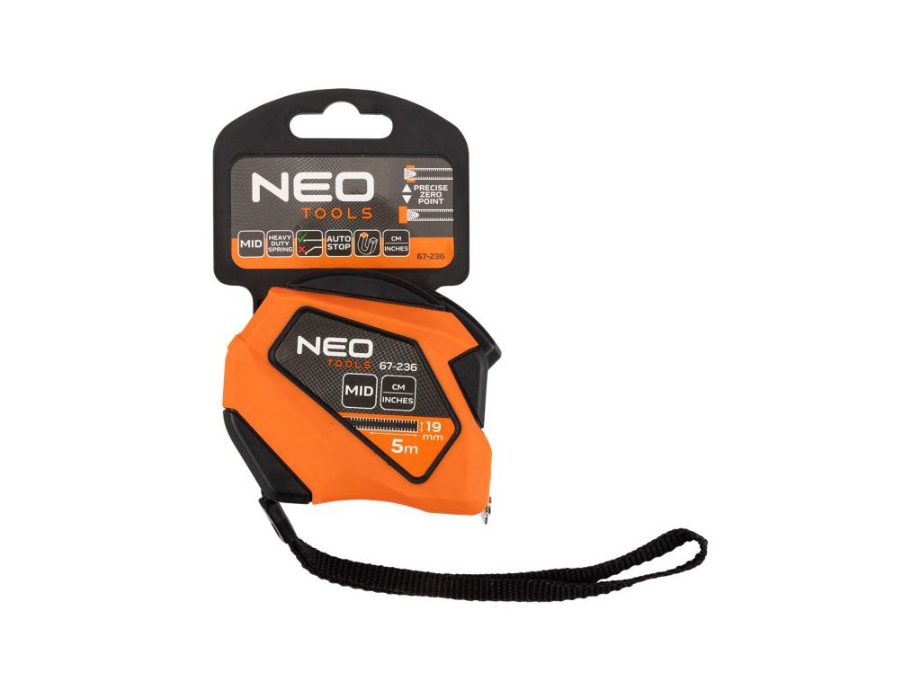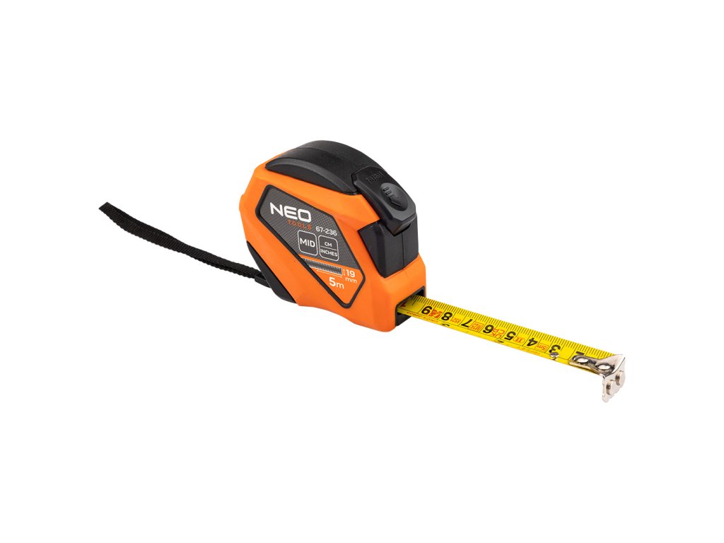 Ocelový svinovací metr NEO TOOLS 67-236 o délce 5 m a šířce 19 mm je praktický měřicí nástroj, který kombinuje přesnost a odolnost.