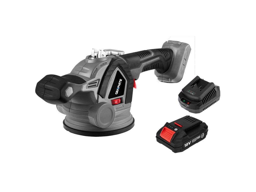 Odsávačka dlaždic Energy+ 18V, baterie a nabíječka od GRAPHITE je akumulátorová odsávačka / podtlakový přísavkový zvedák pro dlaždice, umožňující bezpečnou a ergonomickou manipulaci s těžkými keramickými dlaždicemi, skleněnými deskami a kameninnými panely bez rizika poranění nebo poškození povrchu.
