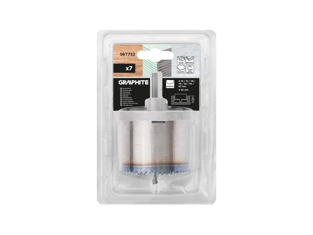 Děrovací pily GRAPHITE 56T752 tvoří praktickou sadu určenou pro práci se dřevem, sádrokartonem a plasty. V balení najdete 7 kusů pilových korunek o průměrech 26, 32, 38, 45, 50, 56 a 63 mm, které pokryjí široké spektrum použití při montážích a stavebních úpravách.