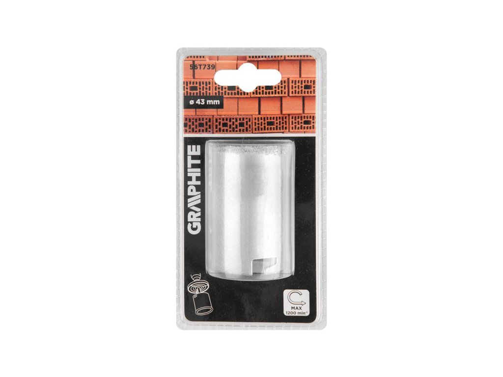 Nástroj má průměr 43 mm, výšku 68 mm a umožňuje vrtání do hloubky až 57 mm. Řezná hrana je opatřena karbidovým povlakem, který zajišťuje dlouhou životnost a efektivní práci i v tvrdších materiálech. Maximální doporučená rychlost použití je 1 200 ot./min, což zajišťuje bezpečný a plynulý chod.