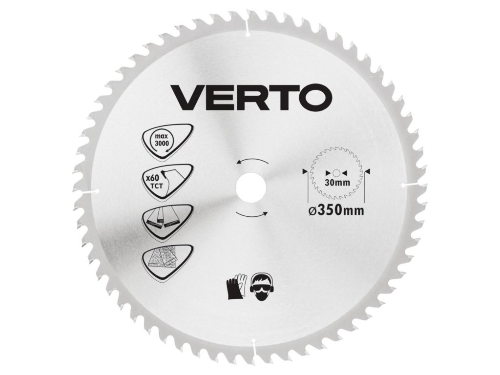 Celokarbidový pilový kotouč VERTO (ref. č. 61H144) s vnějším průměrem 350 mm, zmenšená tloušťka umožňuje získat vyšší řeznou rychlost.