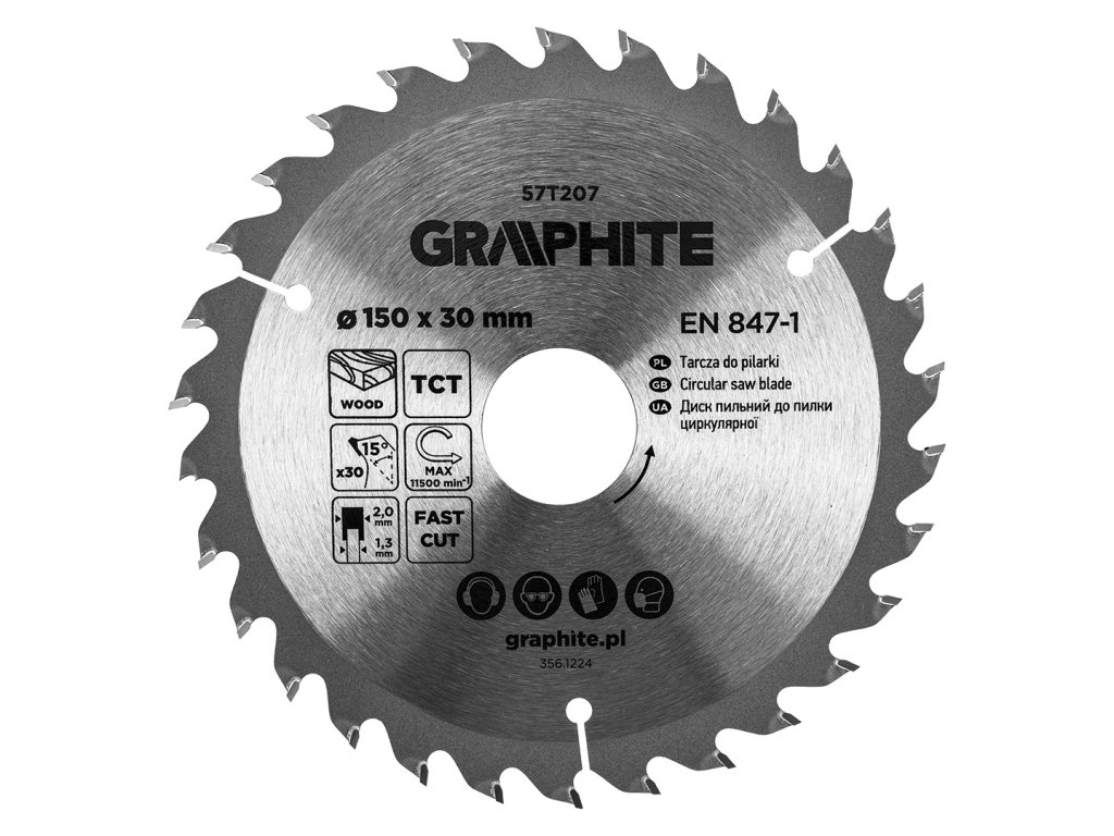 Pilový kotouč GRAPHITE 57T207 s tvrdokovovými (widia) zuby o průměru 150 mm je ideálním nástrojem pro efektivní řezání dřeva a deskových materiálů na bázi dřeva, jako jsou překližka, MDF nebo dřevotříska. Kotouč je vybaven 30 precizně broušenými zuby s úhlem 15°, šířkou řezu 2 mm a zaručuje čistý, rychlý a přesný řez.