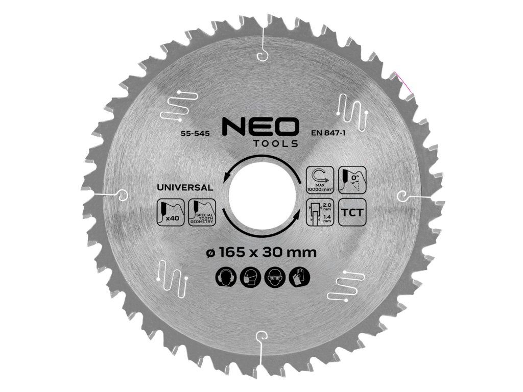 Pilový kotouč, široký, 165 x 30 mm, 40 zubů, univerzální od NEO TOOLS je profesionální pilový kotouč určený pro přímočaré nebo kotoučové pily. Precizně broušené zuby z vysoce legované oceli zaručují čisté a přesné řezy s minimálním třepením materiálu.