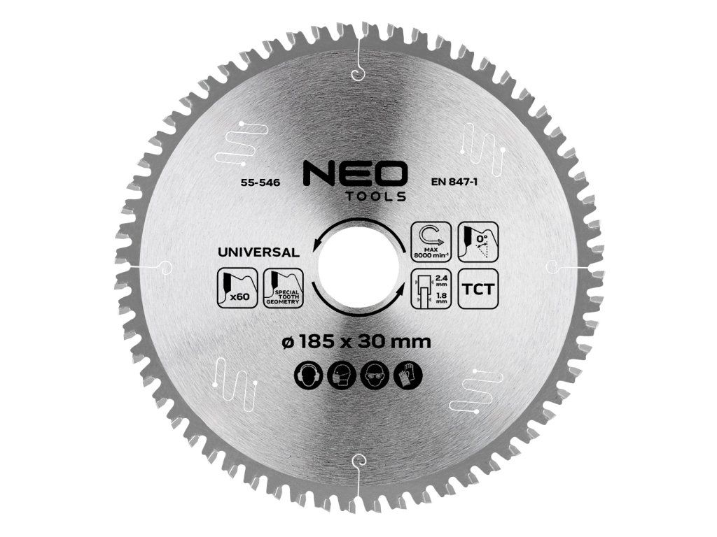 Pilový kotouč, široký, 185 x 30 mm, 60 zubů, univerzální od NEO TOOLS je profesionální pilový kotouč určený pro přímočaré nebo kotoučové pily. Precizně broušené zuby z vysoce legované oceli zaručují čisté a přesné řezy s minimálním třepením materiálu.