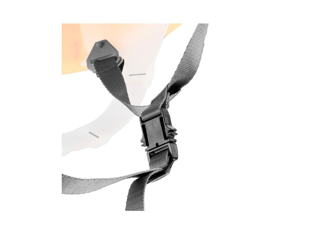 Pro snadné a bezpečné upevnění je vybaven plastovou přezkou, která umožňuje rychlé nasazení a sundání pásku. Nastavitelná délka popruhu umožňuje individuální přizpůsobení, čímž zajišťuje komfort a pevné usazení přilby i při intenzivním pohybu nebo práci v extrémních podmínkách.