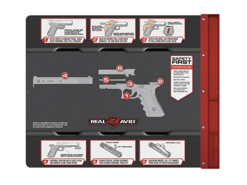 Real Avid Glock Smart Mat je praktická a odolná podložka navržená speciálně pro čištění, údržbu a základní servis zbraní Glock. Povrch podložky je vyroben z materiálu, který je odolný vůči olejům, rozpouštědlům i poškrábání, díky čemuž zůstane vaše pracovní plocha čistá a nepoškozená.