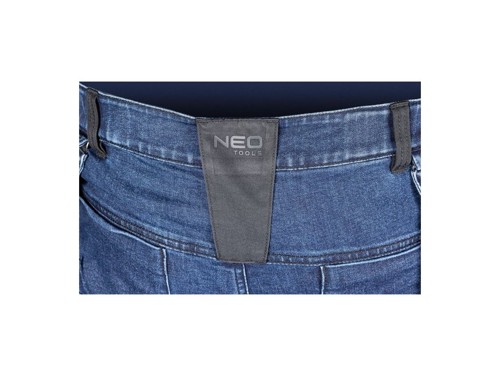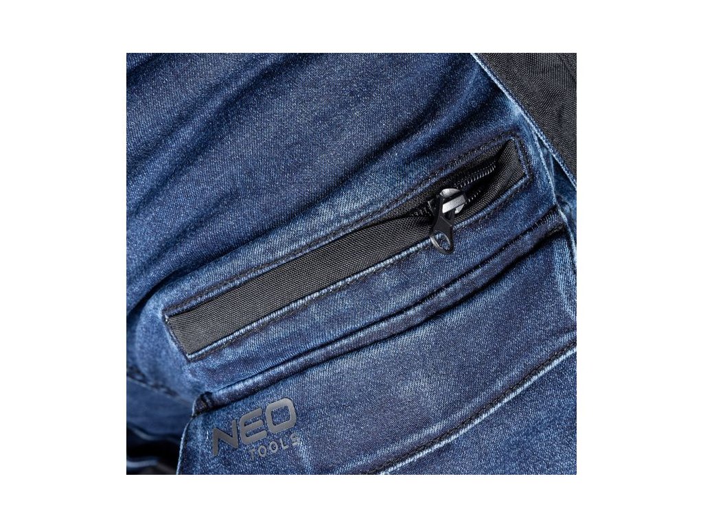 Kalhoty jsou vybaveny odnímatelnými kapsami na pouzdra, praktickými multifunkčními kapsami (dodatečně vyztuženými a se zipy), elastickým pasem a klipsem na nářadí. Kapsy na chrániče kolen spolu s profilovanými koleny zajišťují vysoký komfort při každodenním nošení. Další odolnost poskytují výztuhy na kolenou a lemu nohavic. Charakter značky podtrhuje tištěné logo NEO TOOLS na zádech a nad koleny.