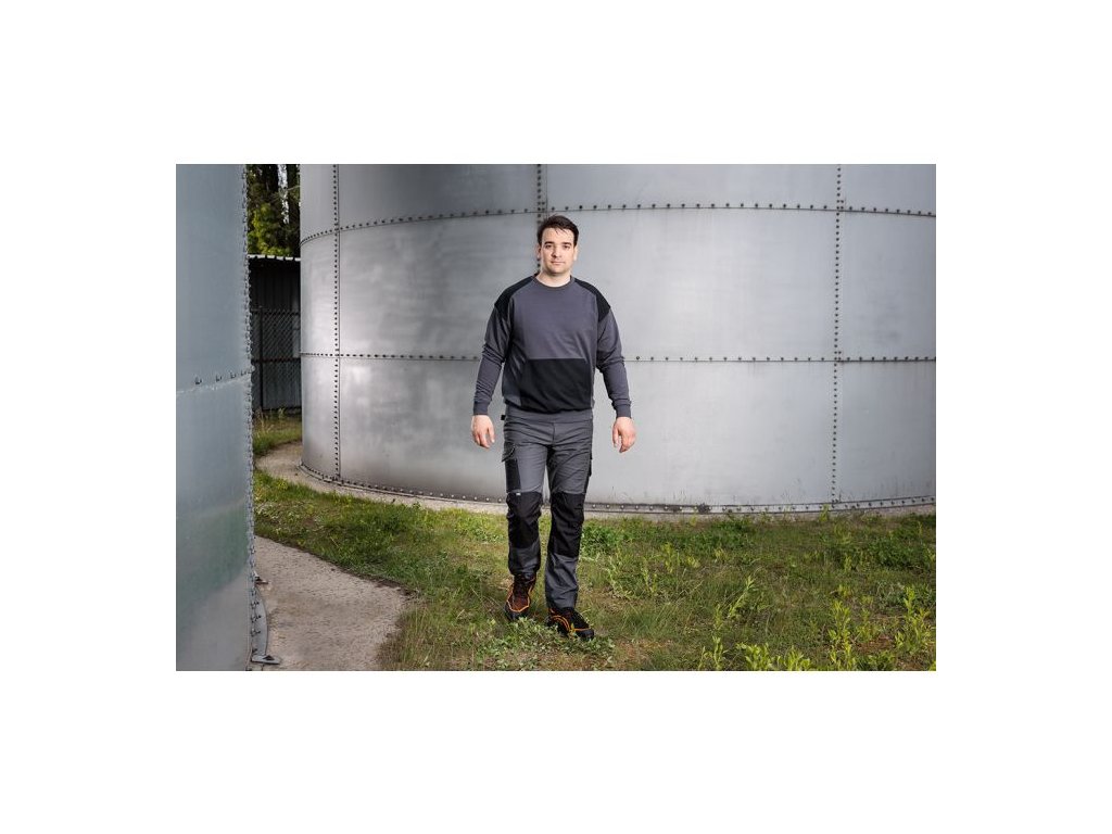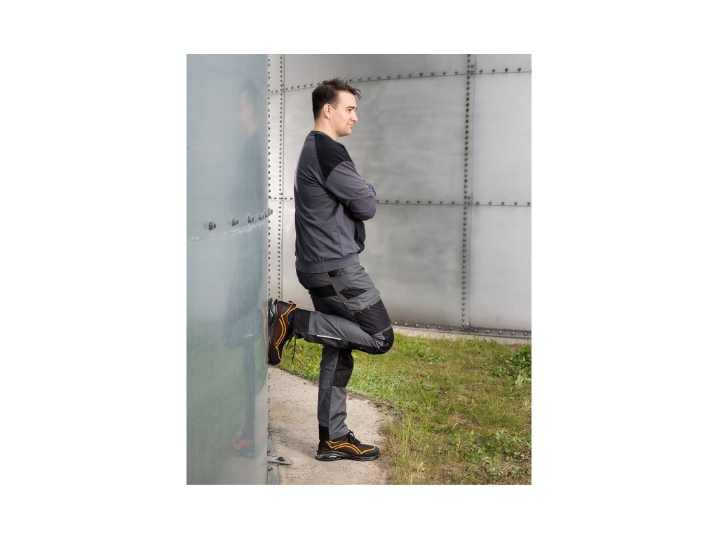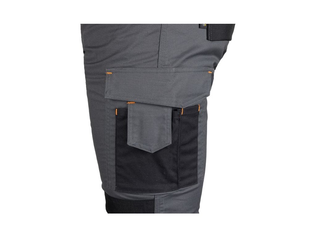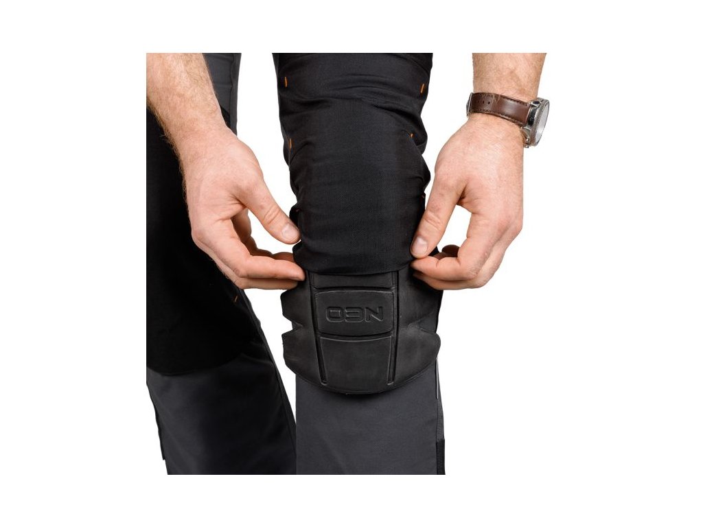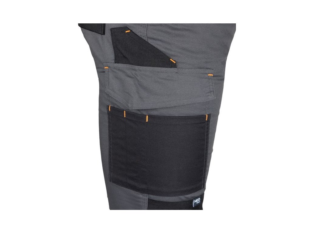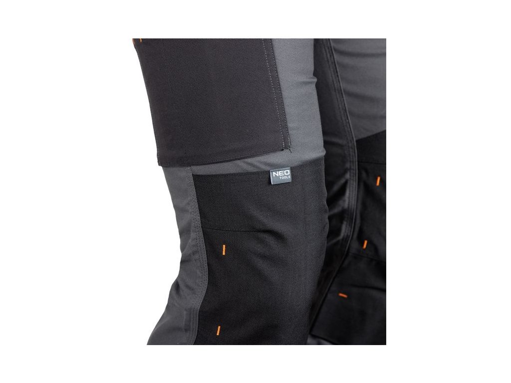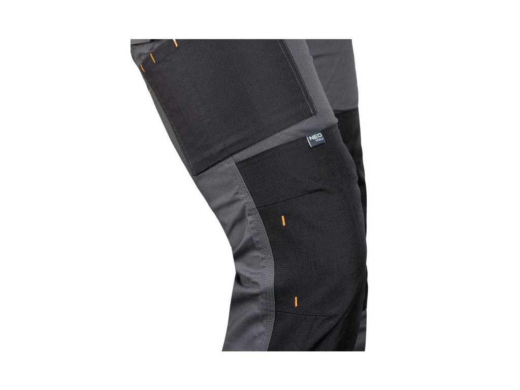Pracovní kalhoty NEO TOOLS Mix&Match v šedo-černé barvě z plátěné tkaniny Canvas s výztuhami z Cordury. Trojité švy, profilovaná kolena, kapsa na chrániče a reflexní prvky. Certifikace CE. Dostupné ve více velikostech.