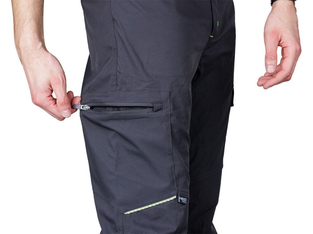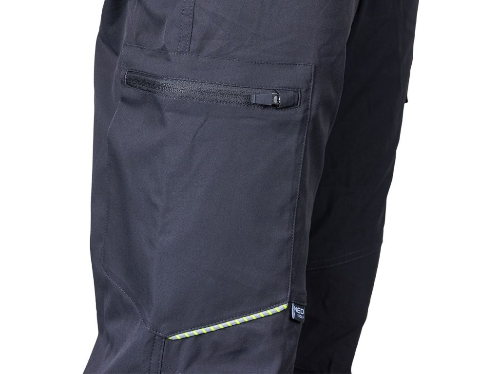 Vyrobené ze 100% polyesteru o gramáži 135 g/m² a doplněné o strečovou tkaninu, kalhoty zajišťují maximální volnost pohybu. Jsou součástí kolekce Mix&Match, což znamená, že je lze snadno kombinovat s dalšími prvky pracovního oblečení značky NEO TOOLS.