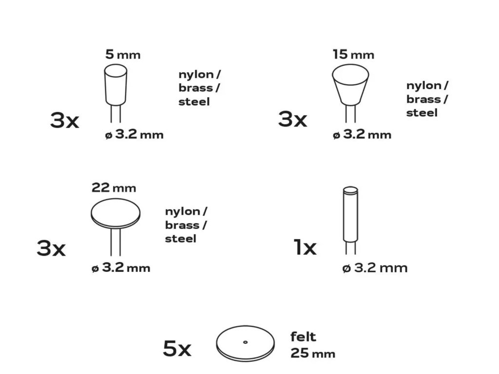 Sada obsahuje drátěné kartáče z vlnité oceli, mosazně pokovené kartáče a nylonové kartáče ve třech tvarech – kartáč, hrnek a kotouč. Tyto nástroje jsou vhodné pro různé úrovně agresivity čištění – od odstranění rzi, barev a usazenin až po šetrné čištění citlivějších povrchů.