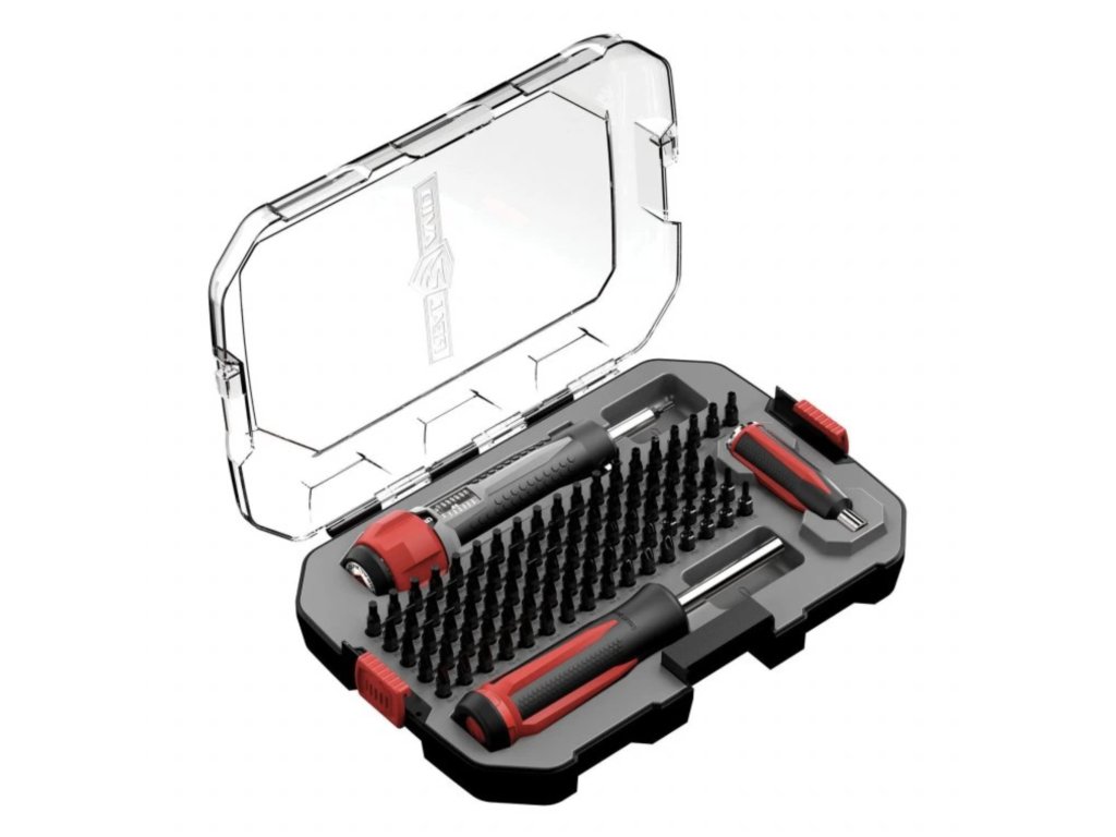 Celá sada je uložena v robustním, přehledně organizovaném kufříku, který obsahuje také dvě magnetické přihrádky pro odkládání drobných šroubků a dílů, aby při práci nic nezmizelo ze stolu.