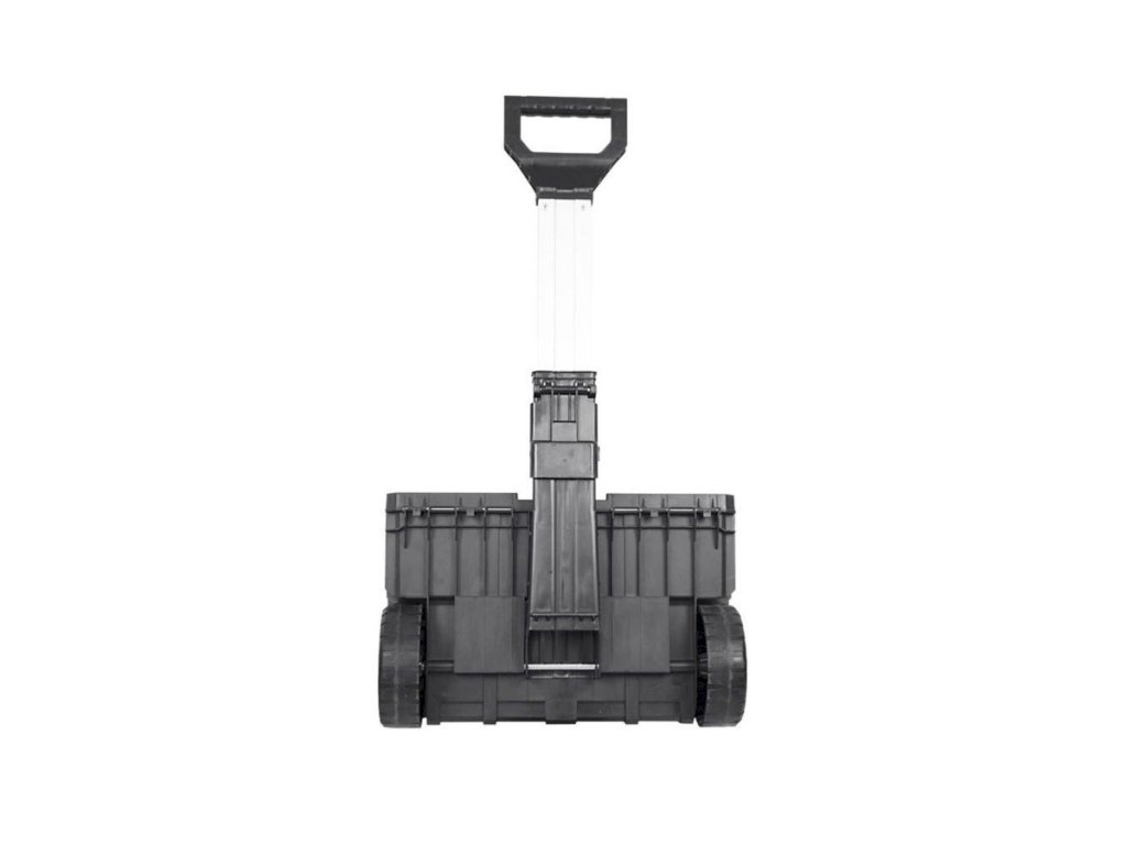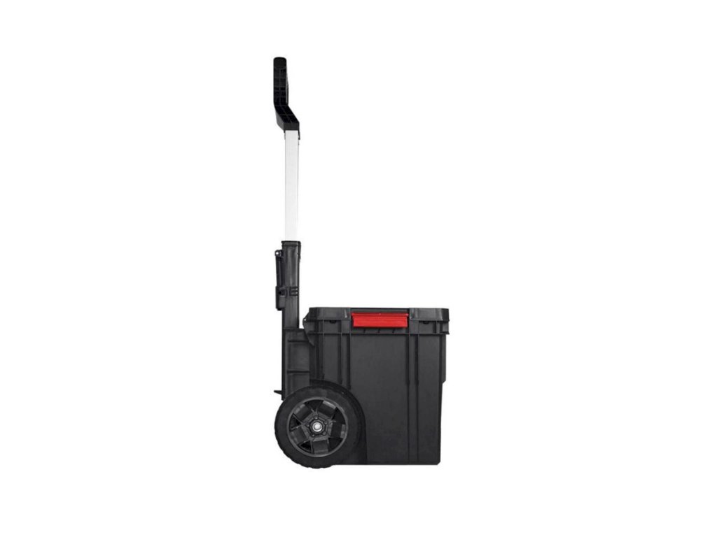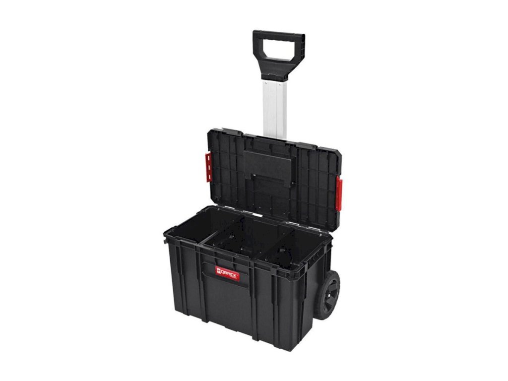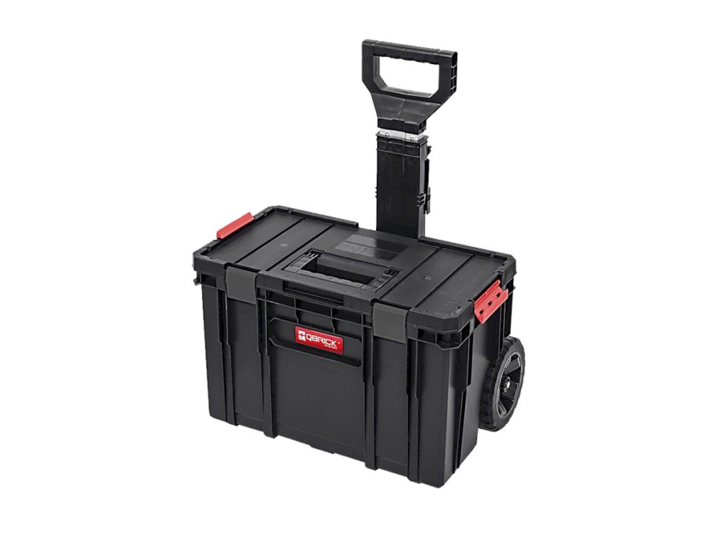 Teleskopická přepravní rukojeť a velká pogumovaná pojezdová kola s kovovou osou zajišťují snadnou manipulaci i v náročnějším terénu, na stavbě nebo v dílně. Box je navíc součástí modulárního systému Qbrick TWO, takže jej lze jednoduše propojit s dalšími kompatibilními boxy.