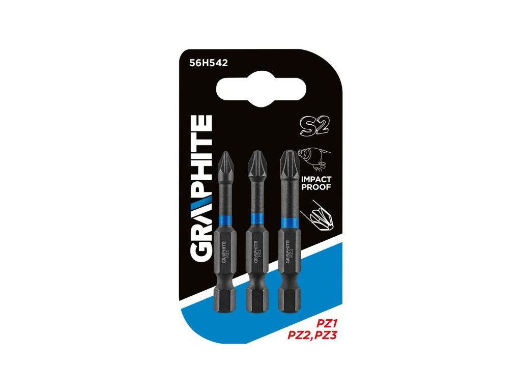 Rázové bity GRAPHITE (ref. 56H542) typ PZ1 / 2/3 o celkové délce 50 mm jsou těžké bity určené pro těžší práci s vysokými kroutícími momenty pomocí šroubováků nebo rázových utahováků.