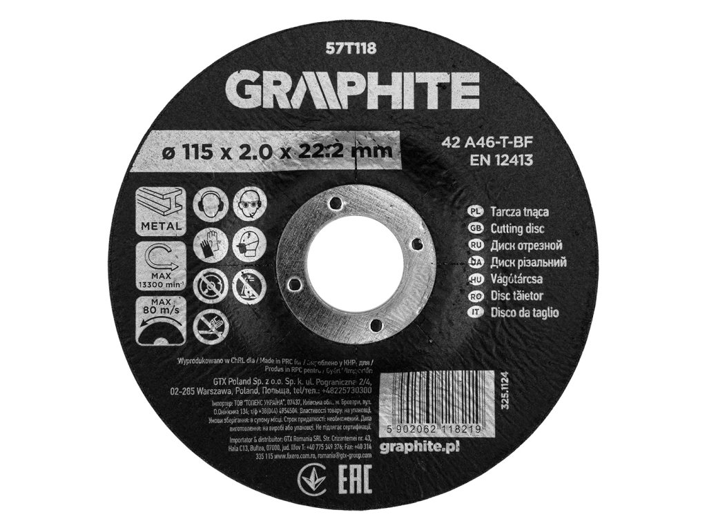 Řezný kotouč na kov 57T118 od značky GRAPHITE je konvexní model typu 42 A46-T-BF, určený pro přesné a efektivní řezání kovových materiálů.
