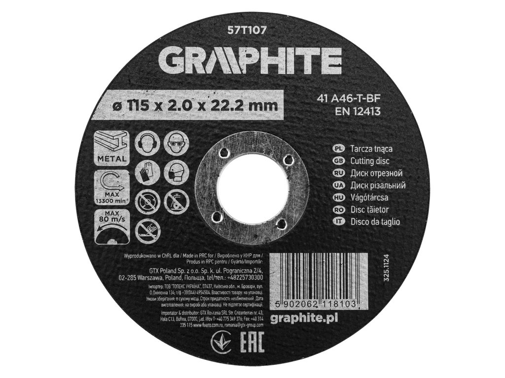 Řezný kotouč GRAPHITE 57T107 je spolehlivý nástroj určený pro efektivní řezání kovových materiálů. Vyrobený z kvalitního korundu (oxidu hlinitého) se vyznačuje dlouhou životností a stabilním výkonem. Plochý design (typ 41) je ideální pro čisté a rovné řezy, což ocení jak profesionálové, tak domácí kutilové. Kotouč je navržen pro maximální rychlost 13 300 ot/min a provozní rychlost 80 m/s. Samozřejmostí je splnění normy EN 12413, která garantuje bezpečné použití.