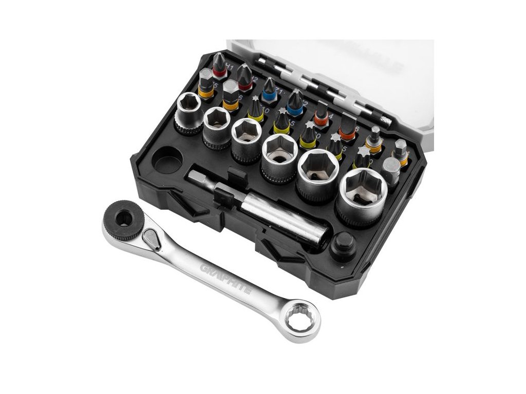 Sada bitů a nástrčných klíčů GRAPHITE 56T559 je univerzální řešení pro širokou škálu prací v dílně i domácnosti. Obsahuje celkem 24 kusů příslušenství, včetně oboustranné ráčny, magnetického držáku a nejběžnějších bitů a hlavic. Všechny díly jsou vyrobeny z odolné chrom-vanadové oceli (CrV), která zajišťuje dlouhou životnost, spolehlivost a komfort při práci.