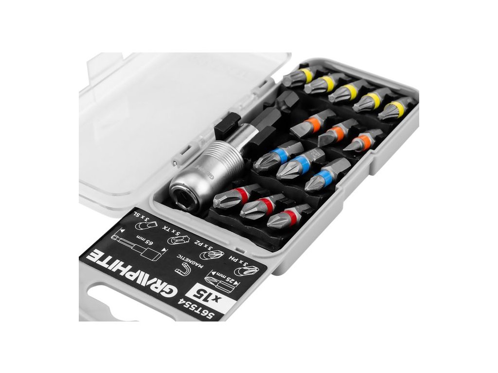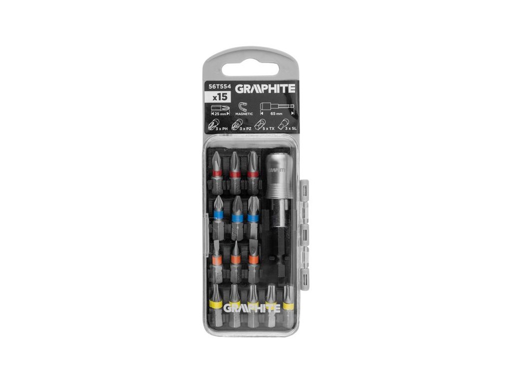 Sada bitů GRAPHITE 56T554 je praktická a kompaktní volba pro práci s nejběžnějšími typy šroubů. Obsahuje 15 kusů příslušenství – bity o délce 25 mm a magnetický držák dlouhý 65 mm. Všechny komponenty jsou vyrobeny z odolné chrom-vanadové oceli (CrV), která zajišťuje dlouhou životnost a spolehlivost při častém používání. Díky univerzálnímu šestihrannému uchycení 1/4" je sada kompatibilní s většinou standardních nářadí.