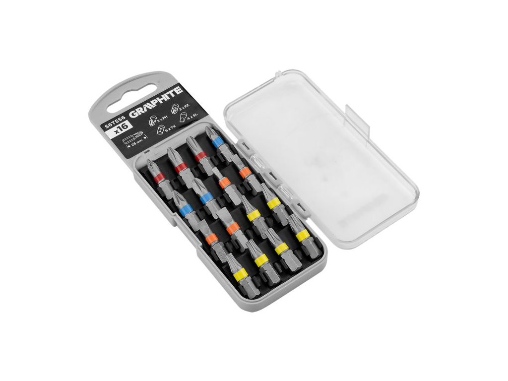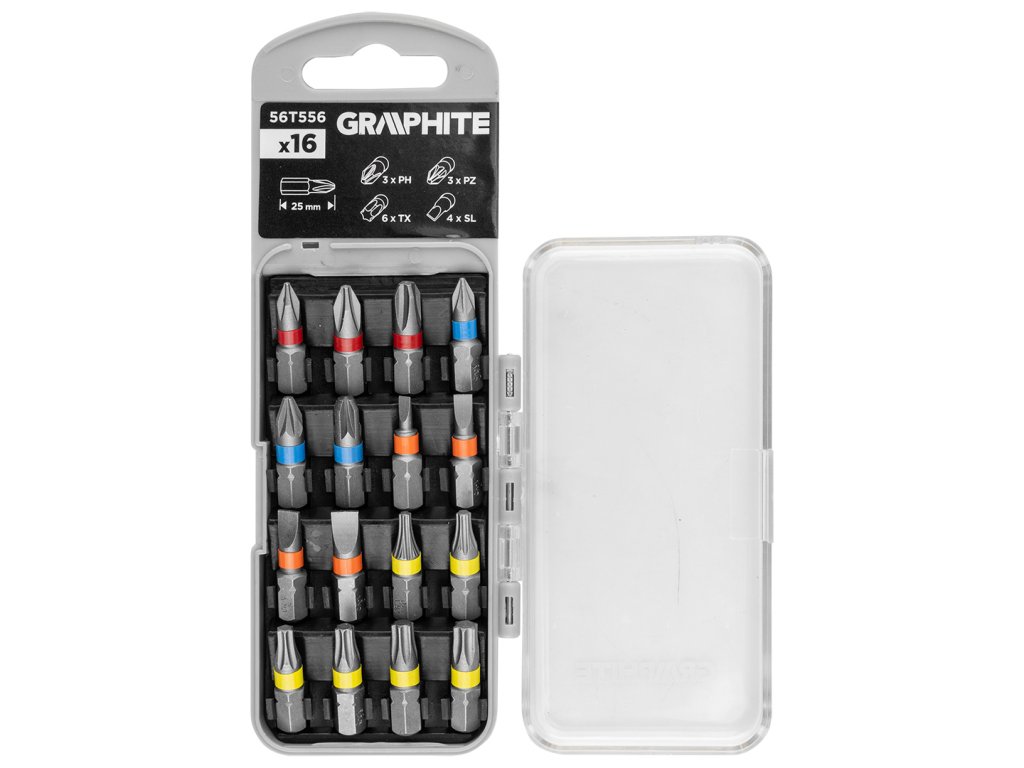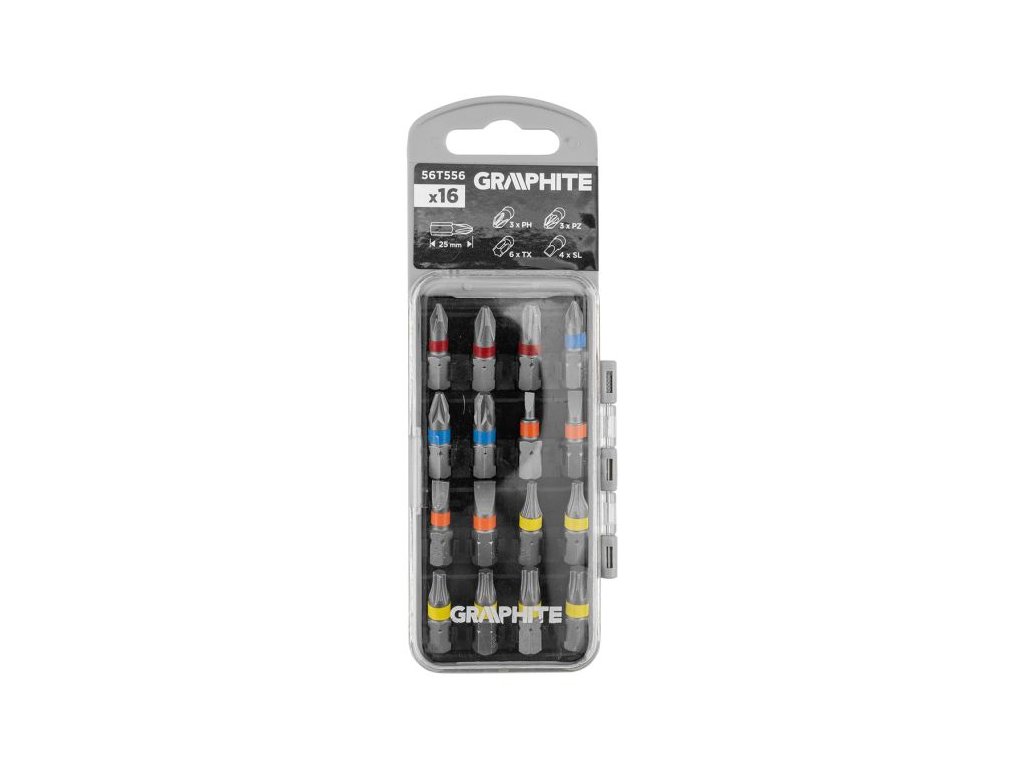 Sada bitů GRAPHITE 56T556 je univerzální volbou pro každodenní práci s nejběžnějšími typy šroubů. Obsahuje 16 bitů o délce 25 mm, které jsou vybaveny standardním 1/4" šestihranným uchycením. Díky použití kvalitní chrom-vanadové oceli (CrV) jsou bity odolné proti opotřebení a zajišťují dlouhou životnost i při intenzivním používání.