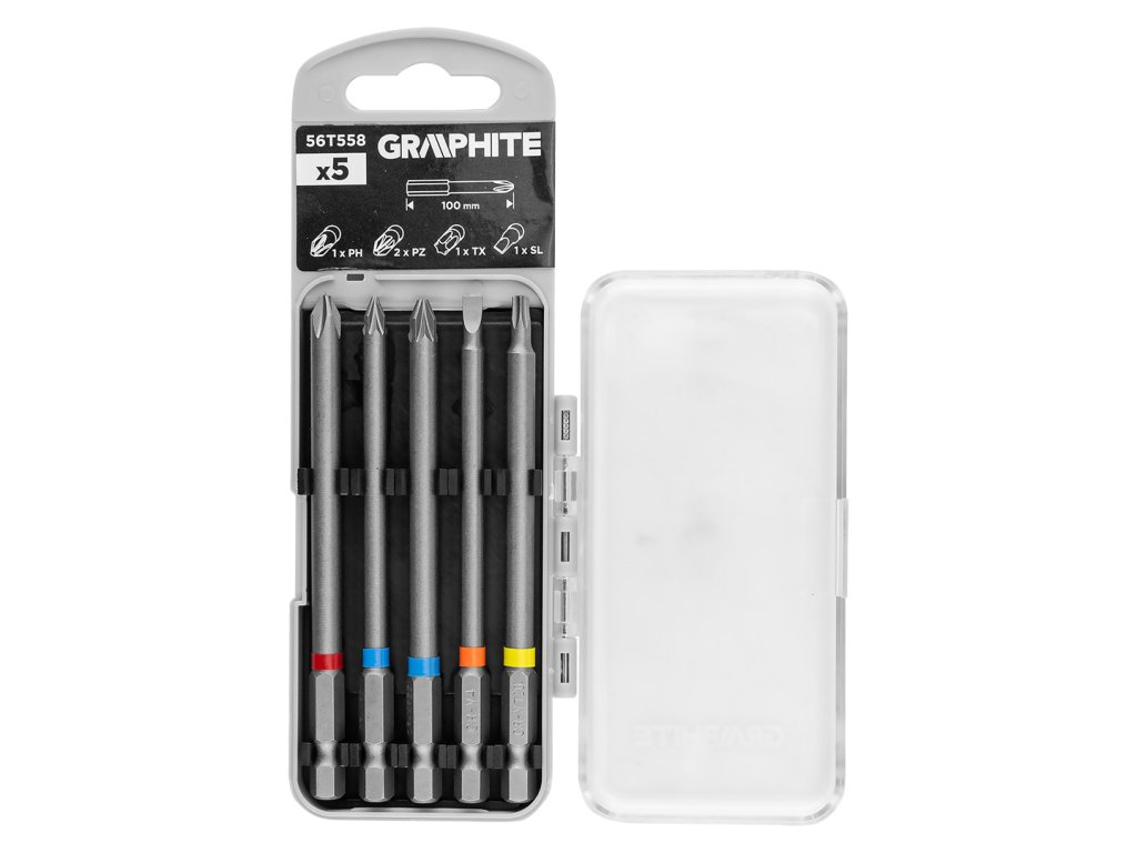 Sada bitů GRAPHITE 56T558 je určena pro šroubování v místech, kde je potřeba delší dosah. Obsahuje 5 prodloužených bitů o délce 100 mm, vybavených standardní 1/4" šestihrannou stopkou. Všechny bity jsou vyrobeny z odolné chrom-vanadové oceli (CrV), která poskytuje vysokou pevnost, trvanlivost a odolnost proti opotřebení i při náročném používání.