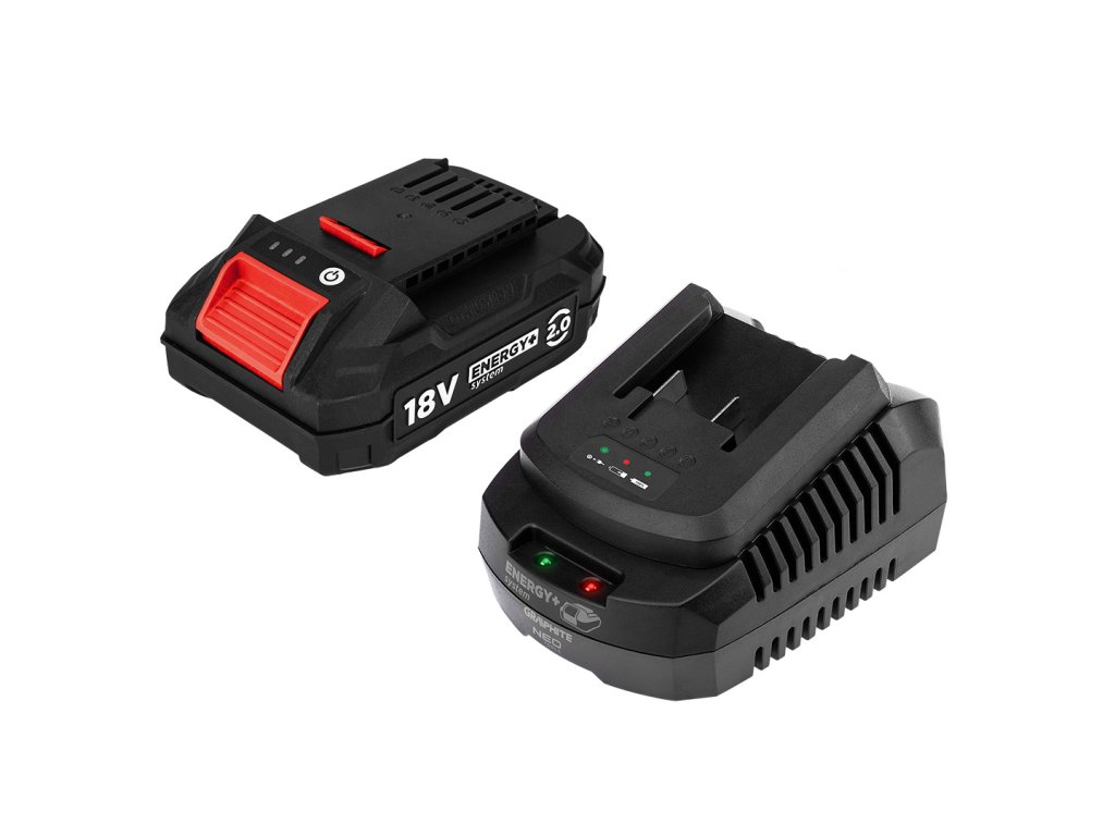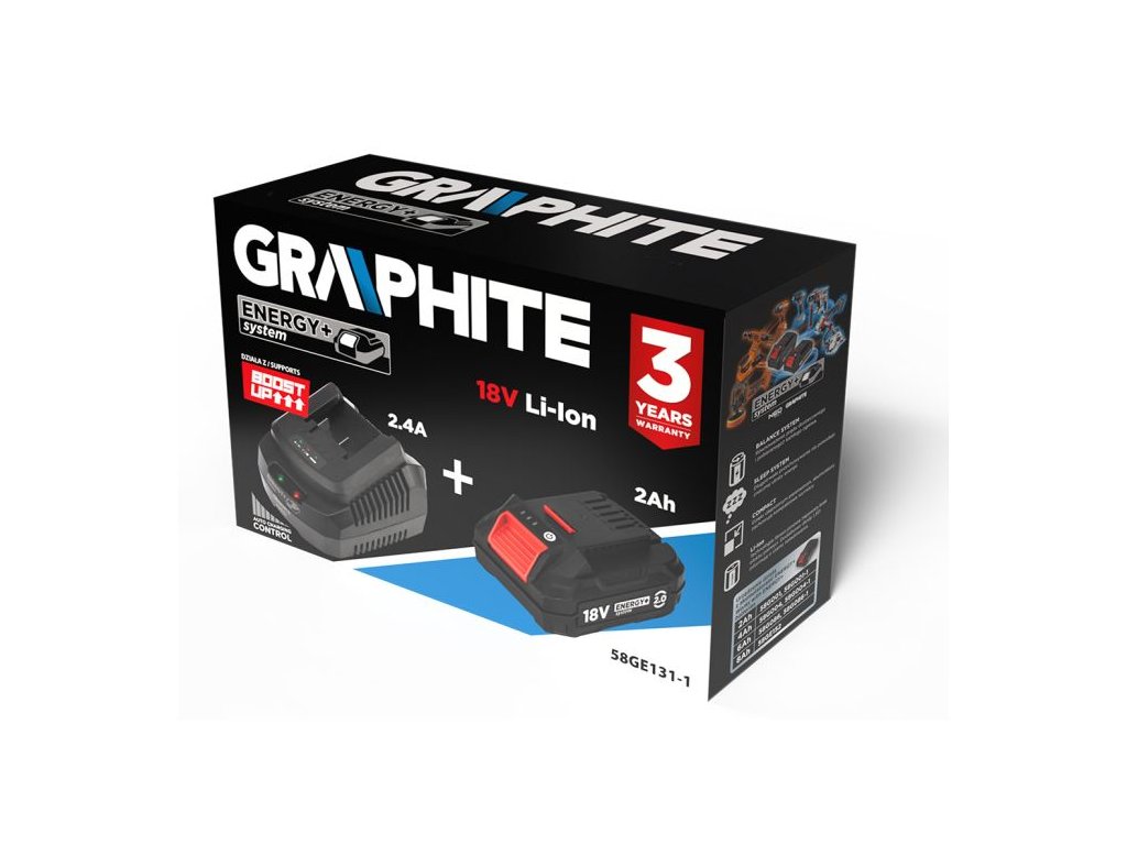 Sada Energy+ GRAPHITE 58GE131-1 je praktickým řešením pro každého, kdo používá akumulátorové nářadí řady Energy+. Obsahuje 18V lithium-iontový akumulátor 2 Ah (58G001-1) a rychlonabíječku 2,4 A (58G002-1). Akumulátor je vybaven spánkovým režimem, který zabraňuje ztrátě energie při dlouhodobém skladování, a nechybí ani indikátor nabití. Elektronický systém řízení teploty a proudu zajišťuje bezpečný provoz při nabíjení i vybíjení.