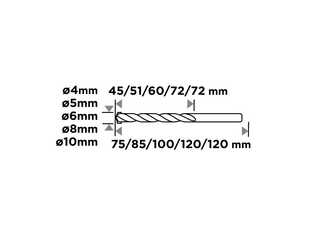 Sada kalených vrtáků do betonu 4 / 5 / 6 / 8 / 10 mm, 5 ks