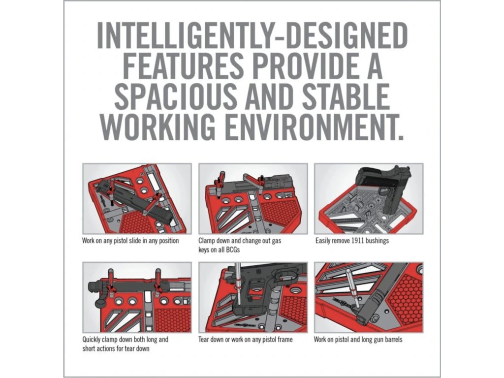 Podložka je vyrobena z odolné průmyslové pryskyřice, která neničí povrch zbraně. Je navržena tak, aby vyhovovala široké škále pistolí, pušek i zbraňových komponentů. Díky 14 otvorům, 2 žlábkům a zabudovanému magnetu nabízí maximální flexibilitu při vyklepávání pinů a práci s drobnými součástkami.