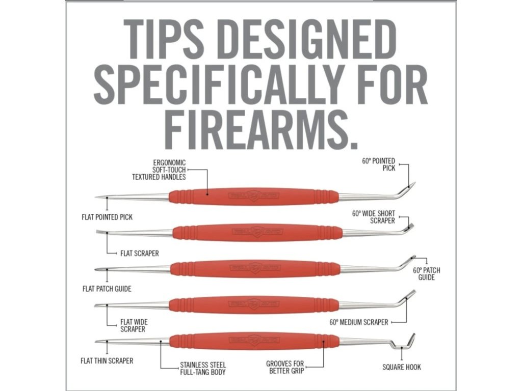 Souprava ocelových škrabek Real Avid je profesionální sada nástrojů určená pro detailní čištění zbraní. Škrabky byly speciálně navrženy pro odstranění karbonu, usazenin a nečistot z míst, kam se běžné kartáčky nedostanou.