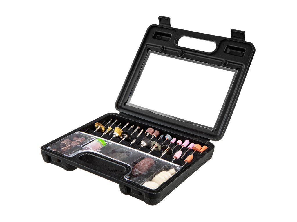 - Obsahuje různé brusné, řezné a vrtací nástroje.