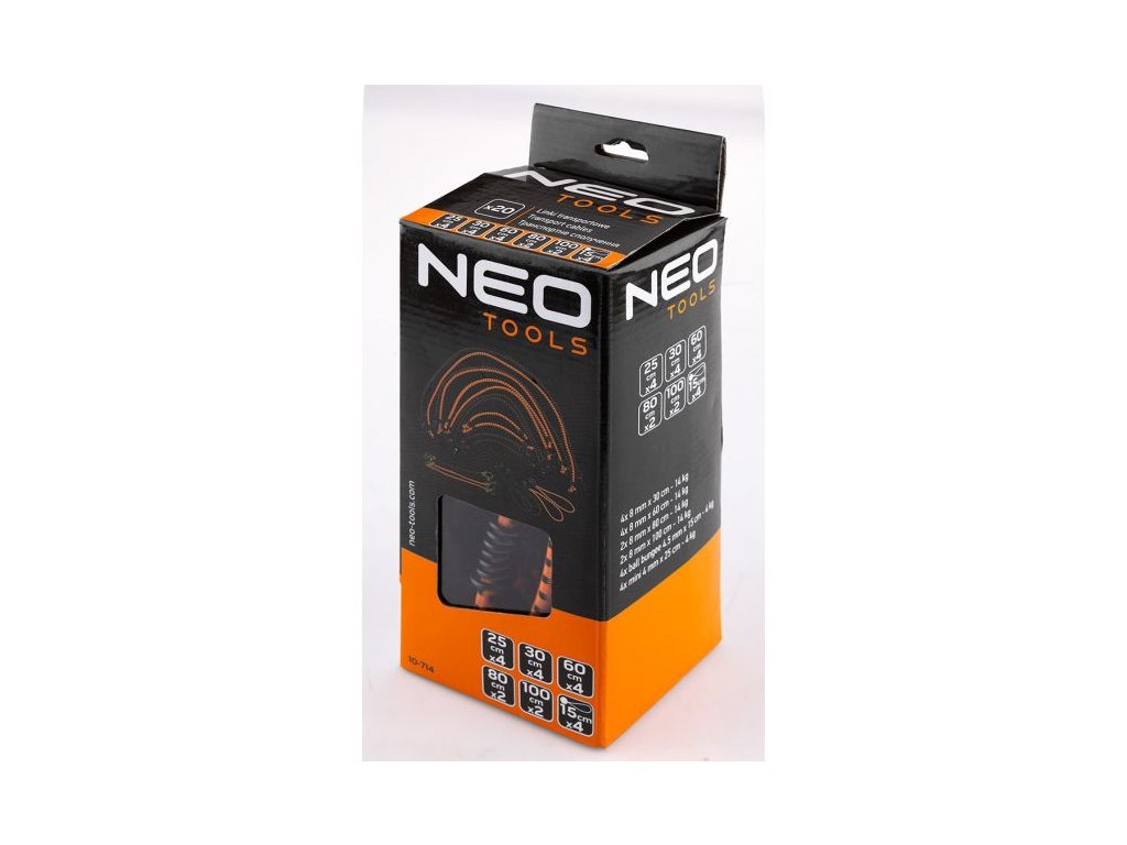 Sada transportních lan NEO TOOLS 10-714 je ideální pro upevnění, přepravu i skladování břemen. Obsahuje 20 kusů lan vyrobených z kvalitní kombinace gumy a polypropylenu (PP), která zajišťuje pružnost, stabilitu a vysokou odolnost při každodenním používání. Každé lano je zakončeno pevným hákem, který usnadňuje rychlou a bezpečnou montáž. Díky univerzálnímu použití jsou gumicuky vhodné pro dílnu, domácnost i cestování.