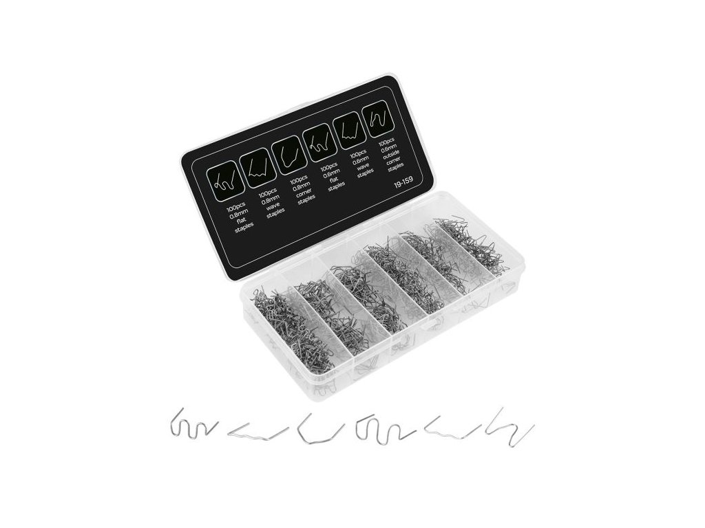 Tato sada obsahuje 600 ks sponek ve 3 tvarech a dvou velikostech drátu (6 mm a 8 mm), což umožňuje univerzální použití při různých opravách.