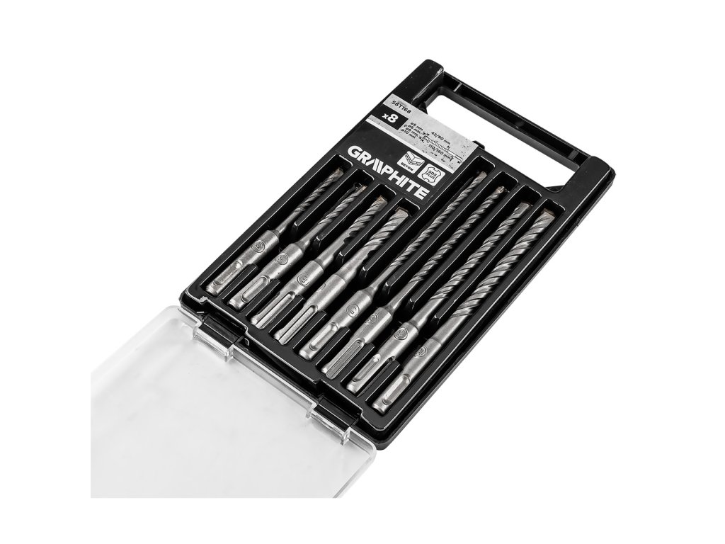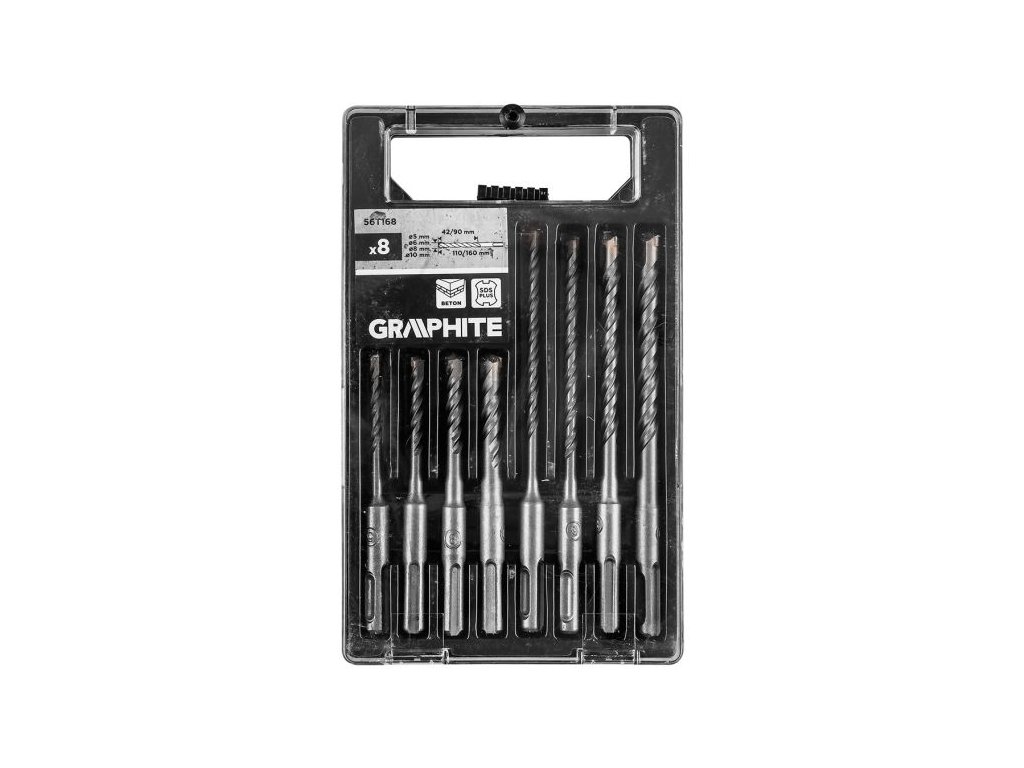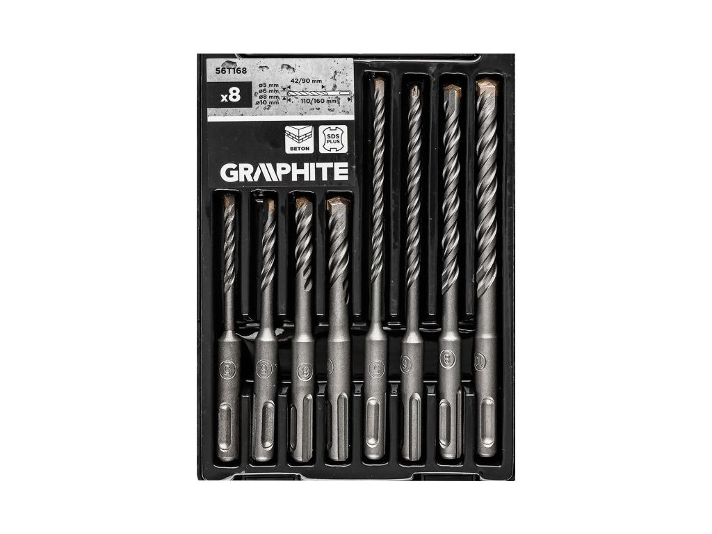 Sada vrtáků do betonu GRAPHITE 56T168 je určena pro efektivní vrtání do betonu, cihel a kamene. Obsahuje 8 kusů vrtáků s průměry 5, 6, 8 a 10 mm ve dvou délkách – 110 mm a 160 mm. Vrtáky jsou vybaveny dvojitou spirálou, která zajišťuje rychlejší odvod prachu a vyšší účinnost vrtání.