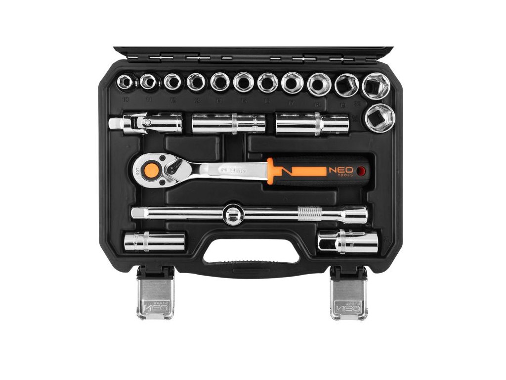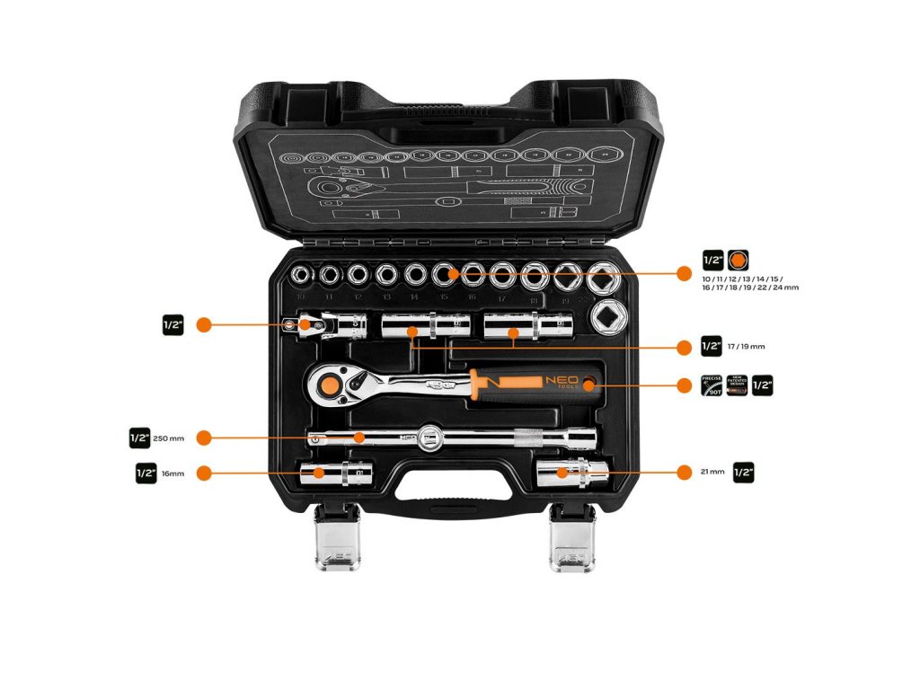 Sada nástrčných klíčů NEO 1/2" (ref. č. 10-032) obsahuje 20 kusů vyrobených z vysoce kvalitní chrom-vanadiové oceli.
