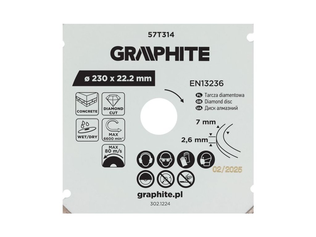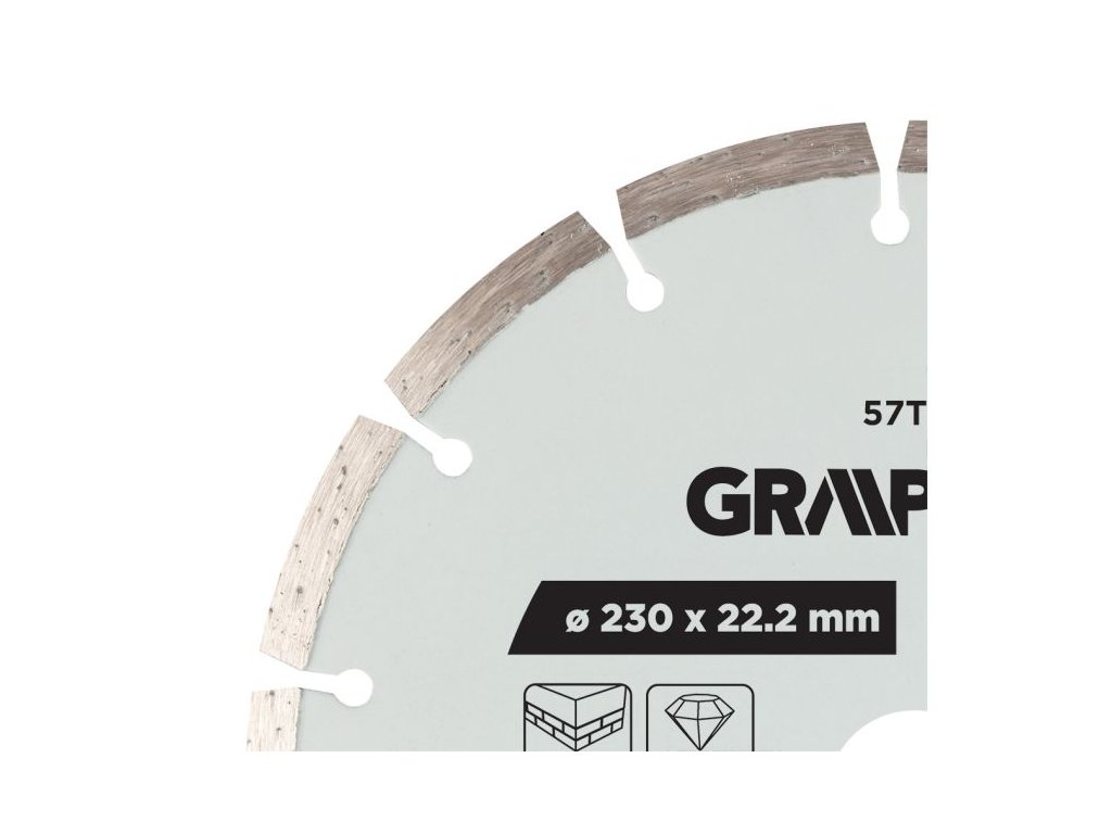 Segmentový diamantový řezný kotouč GRAPHITE 57T314 je určený pro suché i mokré řezání tvrdých stavebních materiálů, jako jsou žula, beton, cihly, kámen a mramor. Má průměr 230 mm a montážní otvor 22,2 mm. Součástí balení je redukční kroužek, který zvyšuje kompatibilitu s různými stroji.