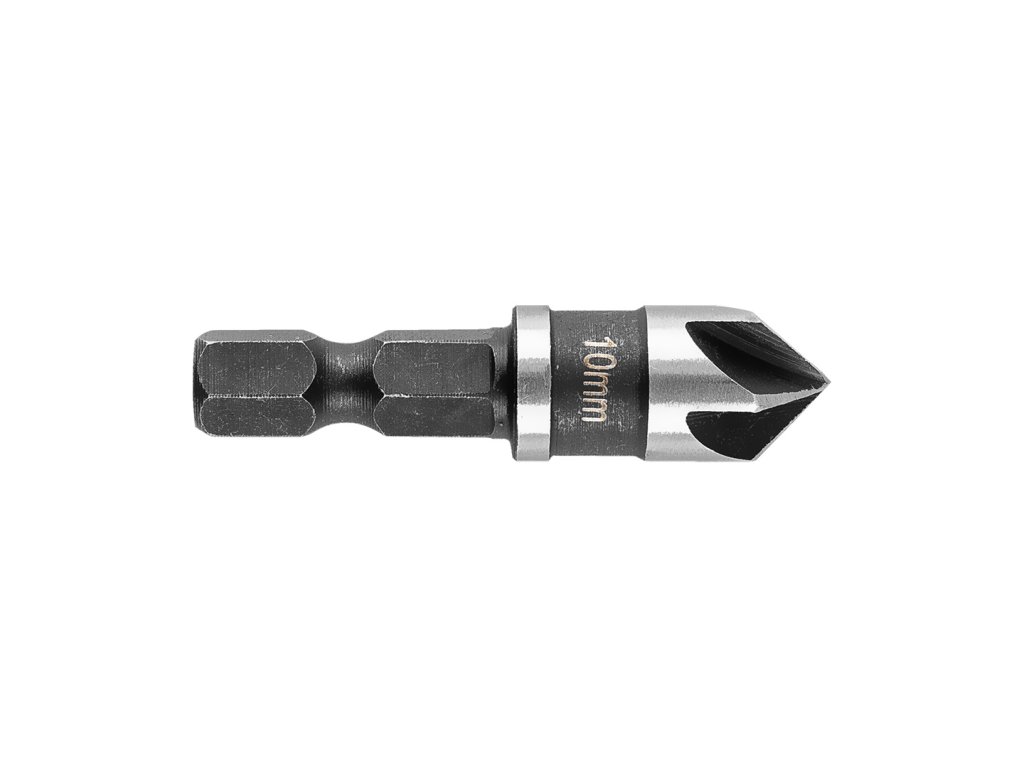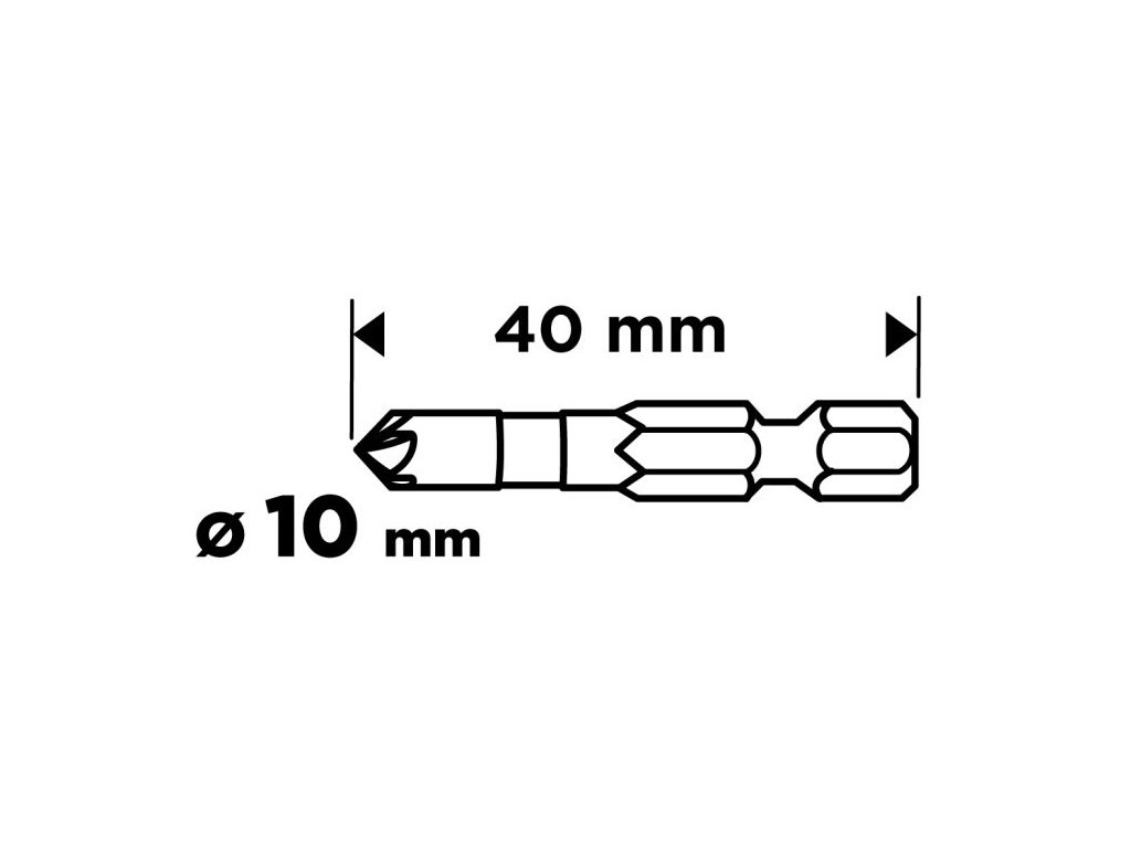 Fréza má průměr 10 mm, celkovou délku 40 mm a úhel hrotu 90°. Díky šestihranné stopce ¼" HEX je kompatibilní s běžnými šroubováky a vrtačkami. Vhodná je pro práci se dřevem, hliníkem i plastem.