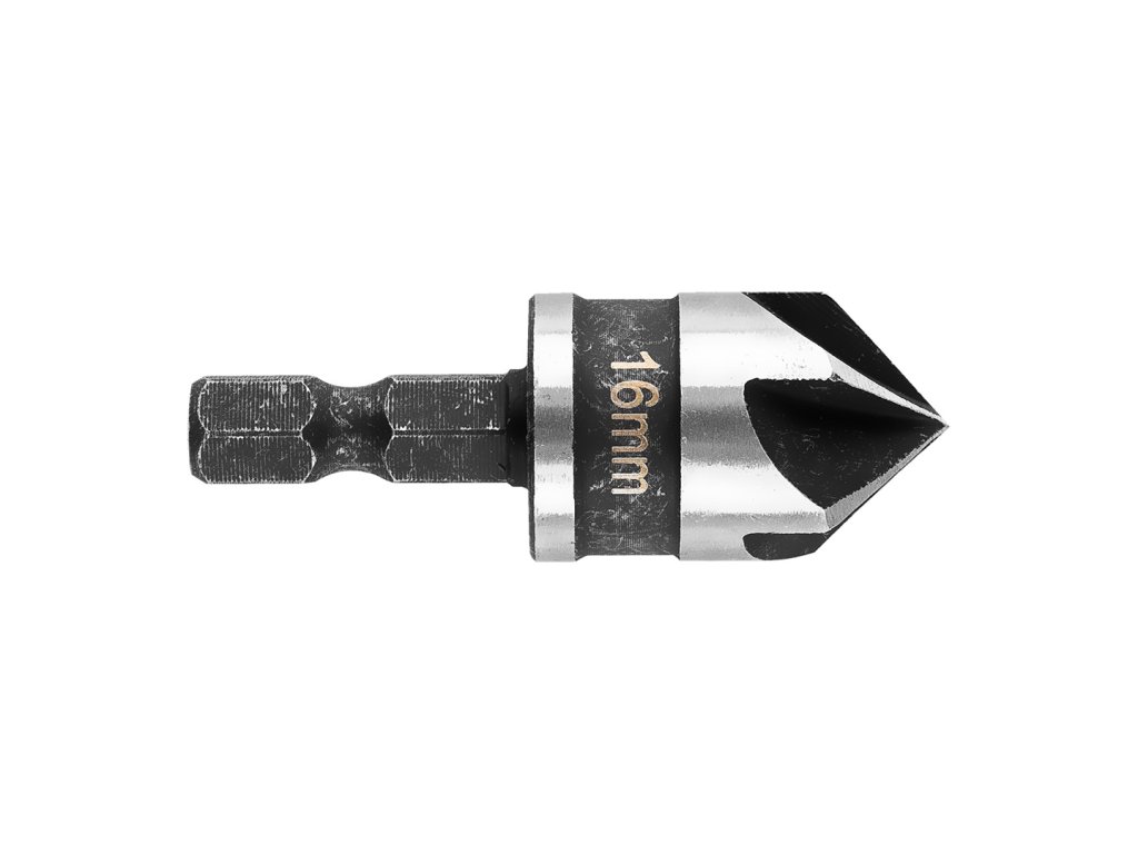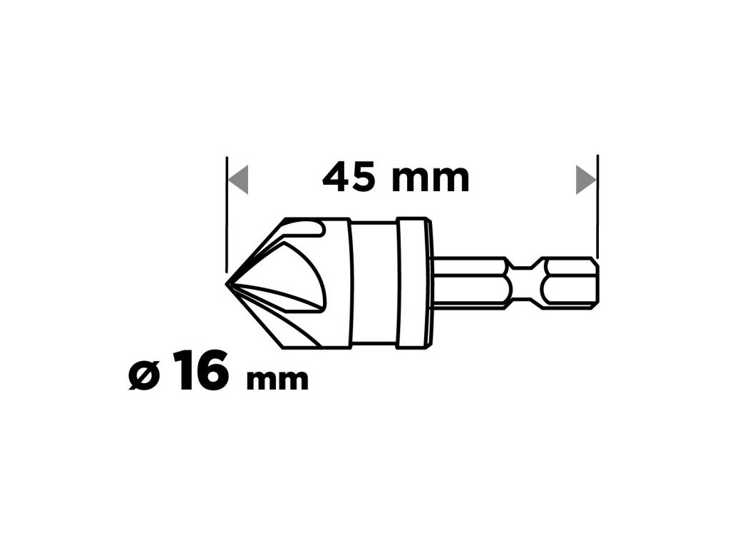 Fréza má průměr 16 mm, celkovou délku 45 mm a úhel hrotu 90°. Je vybavena šestihrannou stopkou ¼" HEX (6,35 mm), která zaručuje pevné uchycení a kompatibilitu s běžnými vrtačkami a šroubováky. Díky odolné konstrukci je vhodná pro práci se dřevem, hliníkem i plastem.
