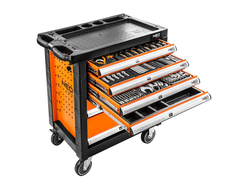 Skříň na nářadí NEO s 10 vložkami (ref. 84-223+G) o rozměrech 770 x 460 x 870 mm. Skříň má 6 praktických zásuvek na nářadí, uzamykatelné pomocí centrálního zámku. Všechny zásuvky jsou plně otevírací a mají pojezdy s kuličkovými ložisky pro zajištění dlouhodobého hladkého a spolehlivého provozu. Zásuvky jsou zajištěny spoušťovou pojistkou pro ochranu okolí při přepravě. Široká pracovní deska z odolného kompozitu spolu s prohlubněmi pro drobné předměty a vyhrazeným prostorem pro svěrák zvyšují použitelnost výrobku. Anti-beat rohy zajišťují bezpečnost okolí. Pětipalcová, tichá, otočná kola usnadňují manévrování se skříní, navíc vybavená brzdou. Nosnost skříně 200 kg. Skříň je vybavena pohodlným pogumovaným madlem pro snadnou manipulaci. Spolehlivost výrobku potvrzuje 25letá záruka. Značka NEO splňuje očekávání profesionálů.Doplňkové parametry