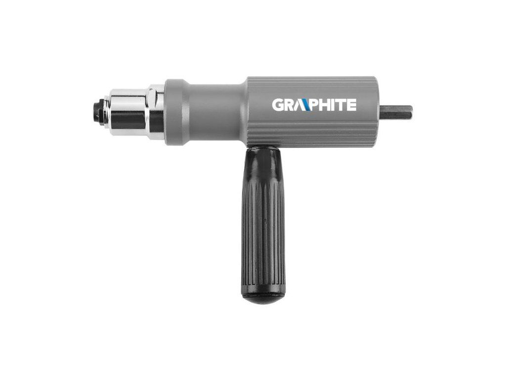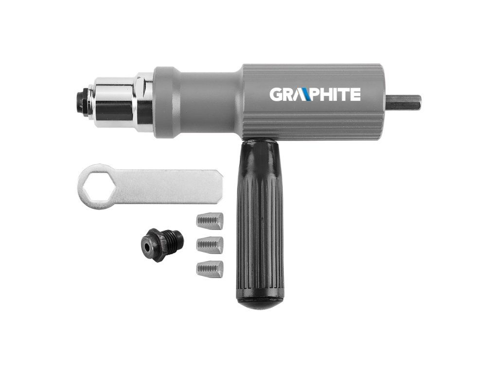 Adaptér nýtu GRAPHITE 56H634 je praktické příslušenství, které umožňuje přeměnit běžný šroubovák na výkonné nýtovací zařízení. Je kompatibilní s ocelovými a hliníkovými nýty o průměrech 2,4; 3,2; 4 a 4,8 mm. Součástí balení je oboustranný klíč pro výměnu koncovek a sada přídavných čelistí, které jsou elegantně uloženy přímo v rukojeti.