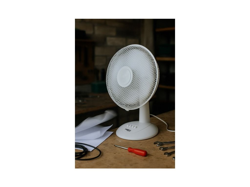 Stolní ventilátor NEO TOOLS 90-011 s výkonem 45 W je praktickým řešením pro ochlazení místností v horkých letních dnech. Disponuje třemi rychlostními stupni a funkcí horizontální oscilace o 70°, která zajišťuje rovnoměrné proudění vzduchu v místnosti.