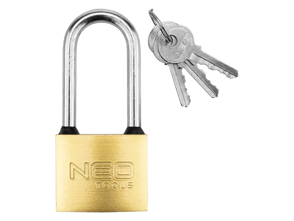Visací zámek NEO TOOLS 50 mm s dlouhým jhem představuje spolehlivé a robustní zabezpečení pro domácí, dílenské i venkovní použití. Tělo zámku je vyrobeno z pevné litiny s měděným povlakem, který zvyšuje odolnost proti korozi a mechanickému namáhání i při dlouhodobém používání.