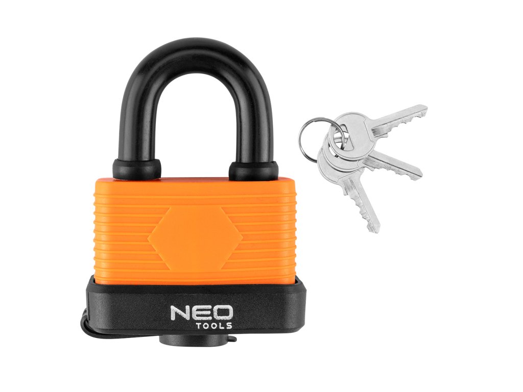 Vodotěsný laminovaný visací zámek s gumovým krytem 40 mm 85-011 od společnosti NEO TOOLS je laminovaný ocelový visací zámek s plastovým krytem a gumovými kroužky na třmenu. Je vybaven třemi klíči. Díky použitým materiálům a vhodné konstrukci se vyznačuje vysokou odolností proti povětrnostním vlivům. Průměr hlavice je 7,5 mm. Jedná se o robustní bezpečnostní zařízení, které lze použít pro různé účely, a to jak v interiéru, tak v exteriéru.Doplňkové parametry