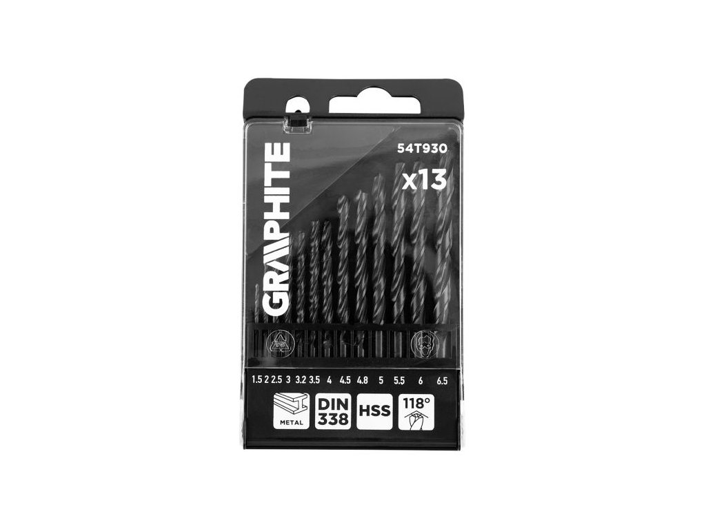 Sada vrtáků do kovu GRAPHITE 54T930 obsahuje 13 kusů vrtáků o průměrech 1,5–6,5 mm. Jsou vyrobeny z rychlořezné oceli HSS, která zajišťuje vysokou pevnost, přesnost a odolnost proti opotřebení.