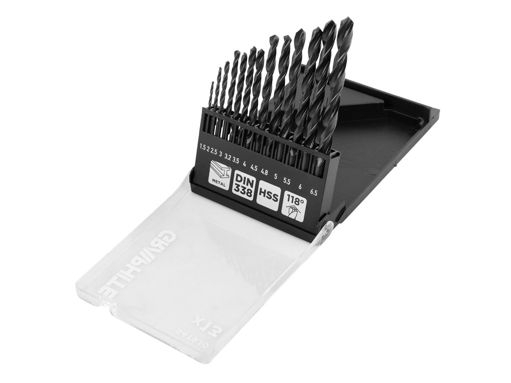 Vrtáky do kovu HSS, 1,5 - 6,5 mm, sada 13 kusů, 54T930 od GRAPHITE jsou vrtáky do kovu o průměrech 1,5, 2, 2,5, 3, 3,2, 3,5, 4, 4,5, 4,8, 5, 5,5, 6, 6,5 mm. Jsou vyrobeny z rychlořezné oceli HSS. Mají válcovou stopku a úhel hrotu vrtáku 118°. Vyhovují normě DIN 338 a jsou vhodné pro každého kutila.Doplňkové parametry