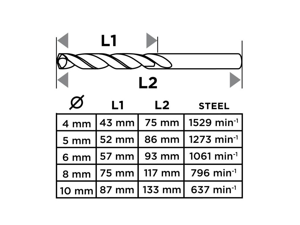 sada obsahuje vrtáky o průměrech: 4 mm, 5 mm, 6 mm, 8 mm, 10 mm