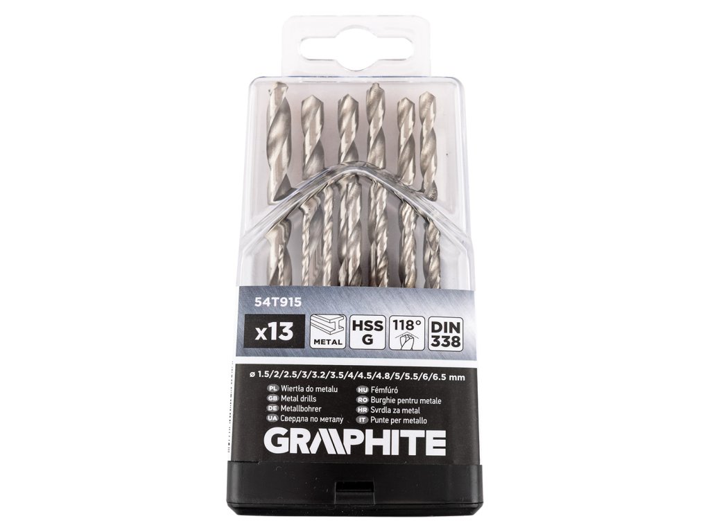 Vrtáky do kovu HSS-G, 1,5 - 6,5 mm, sada 13 kusů, 54T915 od GRAPHITE jsou vrtáky do kovu o průměrech 1,2, 2, 2,5, 3, 3,2, 3,5, 4, 4,5, 4,8, 5, 5,5, 6, 6,5 mm. Jsou vyrobeny z rychlořezné oceli HSS-G. Mají válcovou stopku a úhel hrotu vrtáku 118°. Odpovídají normě DIN 338 a jsou vhodné pro každého kutila.Doplňkové parametry